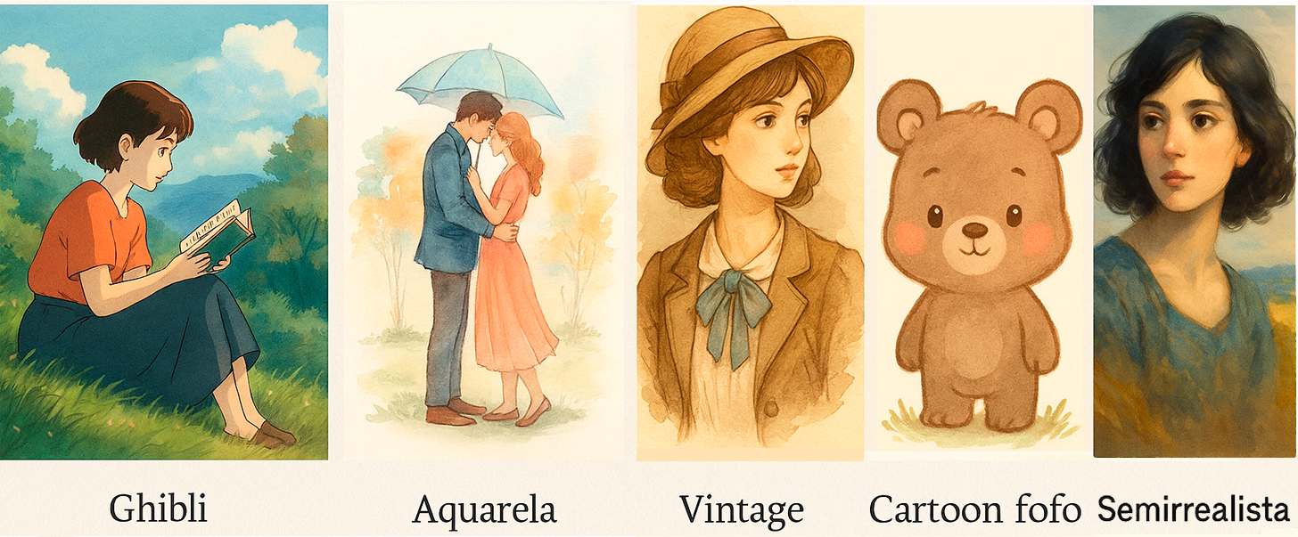 Studio Ghibli, aquarela, pintura clássica, vintage ou traços infantis.