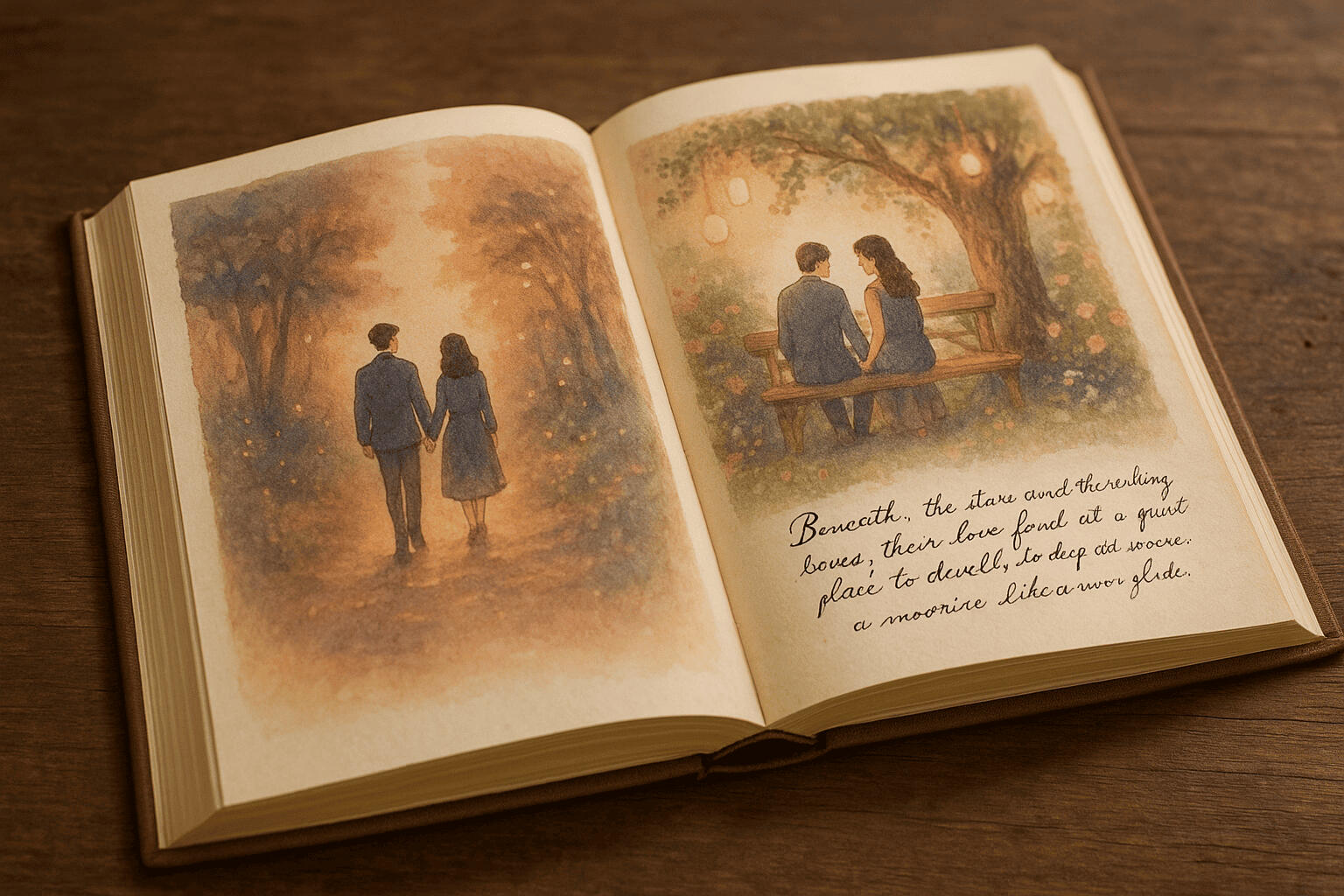 Depois de recebermos suas informações, mergulhamos no que há de mais precioso: sua vivência.A partir disso, criamos uma narrativa única — um conto literário inspirado na sua história real, adaptado com sensibilidade e imaginação. Cada detalhe é pensado para emocionar: os personagens que você descreveu ganham vida nas palavras e nas imagens.Você escolhe o gênero da história e o estilo artístico das ilustrações, ou deixa que a gente te surpreenda com algo feito sob medida, com beleza e cuidado.✨ Porque transformar memórias em arte é o nosso maior dom.